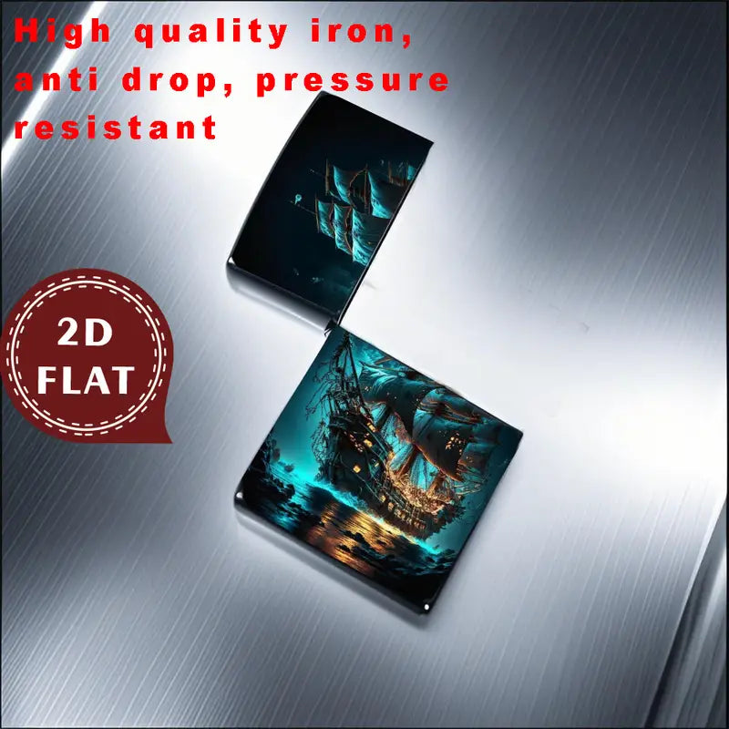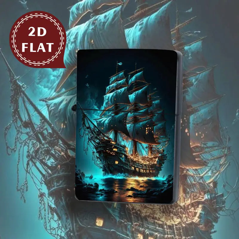 The 2D Nautical Sailing Ship Lighter Shell features a vintage-style retro design of a sailing ship. Made from durable aluminum, this refillable lighter case fits butane and fuel inserts, is flame-resistant, and perfect for men and women. A great gift item with nautical charm.
