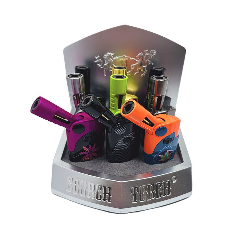 The Scorch Torch - 5" Adjustable Table Torch Leaf Design is a stylish and functional torch lighter designed with an easy-to-use adjustable flame. Featuring a hold button and easy dial for convenience, this torch combines reliability with a unique leaf design. Standing 5 inches tall.