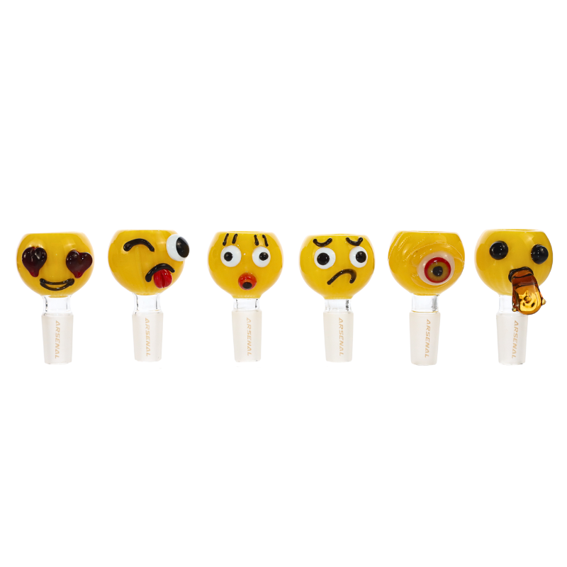The Arsenal 14mm Expression Series Glass Bowl adds a touch of personality and humor to any smoking session. This collection features six high-quality glass bowls, each showcasing a unique and vibrant "emoji" style expression. Crafted for both durability and character, these 14mm male bowls are the perfect way to customize your favorite waterpipe with a look that matches your mood.
