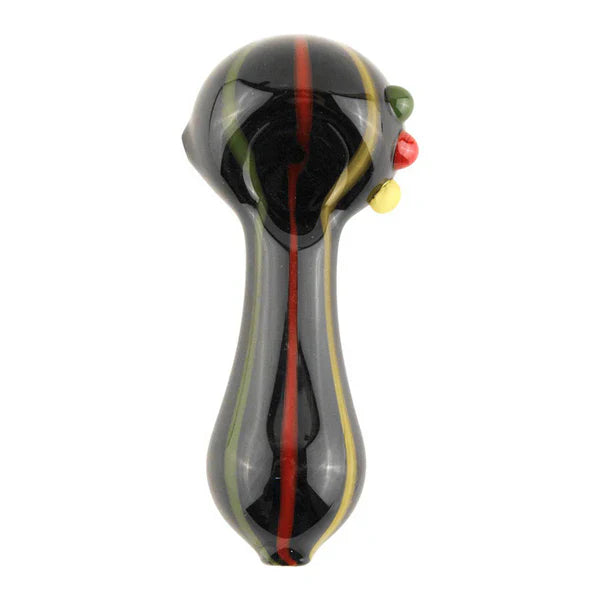 The 4" Rasta Hand Pipe is a compact and colourful piece that combines simplicity with style. Made from solid black glass, this pipe is decorated with three rasta marbles and three rasta stripes, giving it a bold and vibrant look. At 4 inches long, it’s perfect for portability and everyday use.