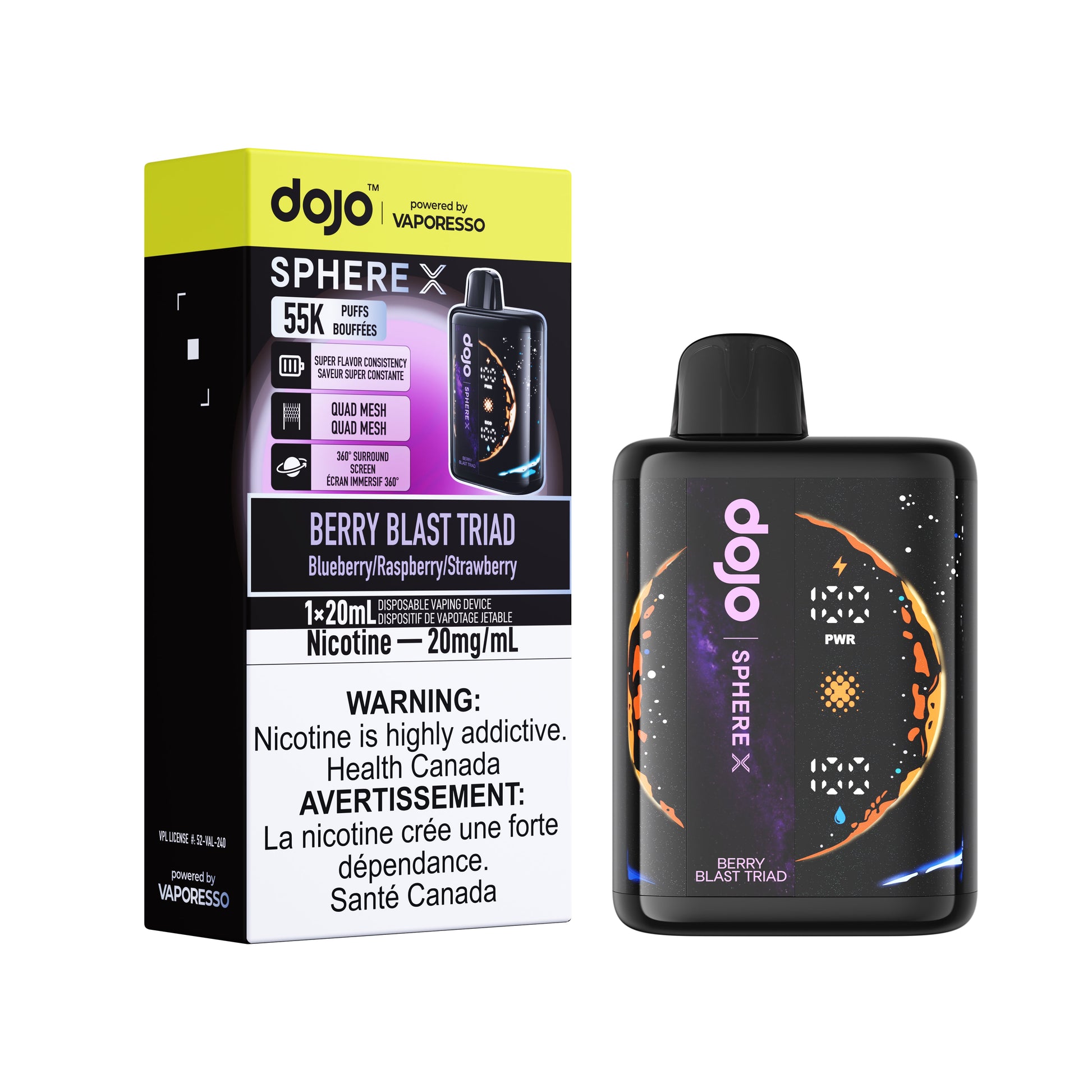 The Dojo Sphere X Disposable Vape 20mL is a 20mL disposable that is rated up to 55,000 puffs. There are two modes: Eco and Power mode that allow for customization. Inside is a quad mesh coil for amplified flavour. This device is powered by a 1100 mah battery and is Type-C rechargeable.