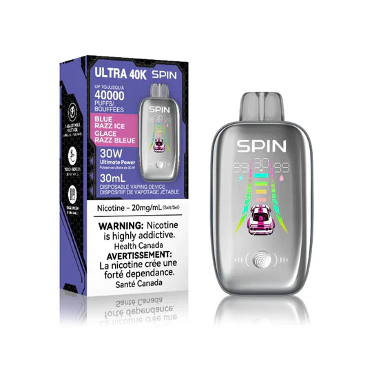 The SPIN Ultra 40K Disposable Vape is rated up to 40,000 puffs and holds 20mL of salt nicotine e-juice. Each disposable has 4 different wattage settings adjusted by the touch screen allowing for a wide range of power (15W-20W-25W-30W).